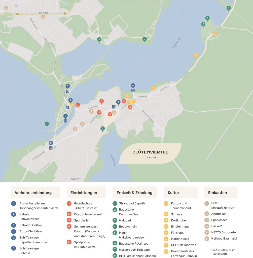 Einerseits inmitten der Natur abseits von städtischem Trubel leben, andererseits die kulturelle Vielfalt und urbane Infrastruktur von Großstädten nutzen – was eigentlich unmöglich klingt, bietet das Blütenviertel in Caputh als Teil der Gemeinde Schwielowsee. Es vereint die Vorzüge von Stadt- und Landleben. Mit öffentlichen Verkehrsmitteln sind Sie schnell in Potsdam und Berlin.