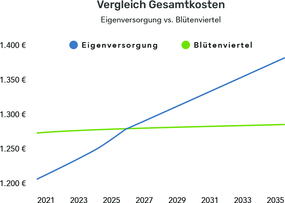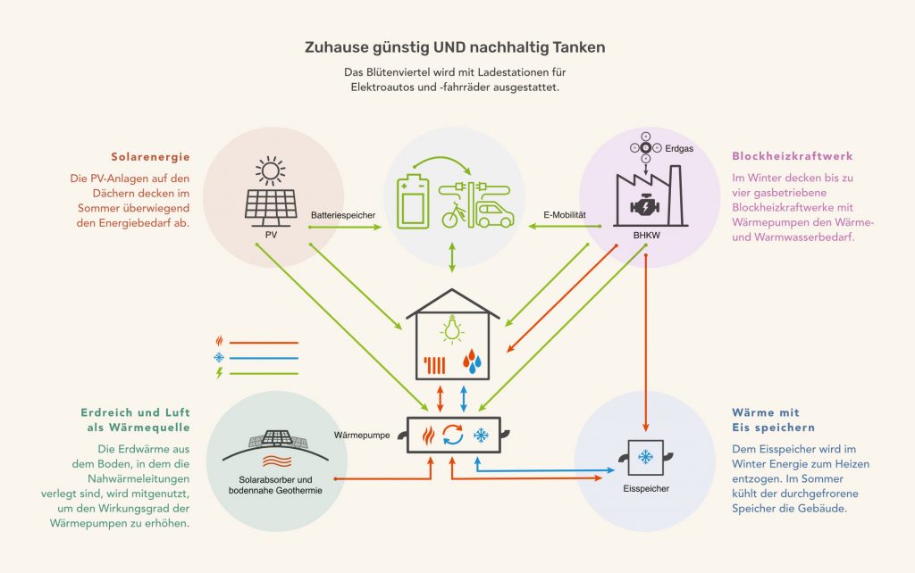 Seiner Zeit voraus ist das Blütenviertel auch bei der Energiegewinnung: Strom und Wärme stammen jetzt schon aus überwiegend regenerativen Quellen. Mit dem intelligent vernetzten und zukunftssicheren Energiekonzept garantiert der eigens gegründete Energieversorger FlowerPower Energy GmbH eine hervorragende CO2-Bilanz sowie langfristig niedrige Energiekosten.
